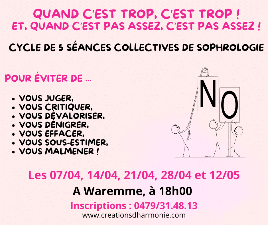 À travers des techniques éprouvées de sophrologie, de relaxation, de respiration et de visualisation positive, vous apprendrez à reconnaître vos limites personnelles et à les respecter.